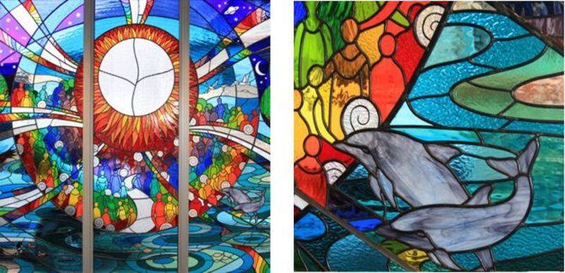This grand and colourful window was designed by Gail Donovan and built by Adelaide Leadlight Centre in 2013. Gail has designed many windows around Australia and beyond and is well known for her outstanding use of colour and symbolism.